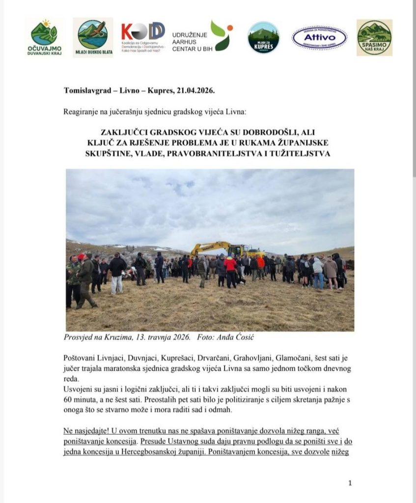 Reakcija više udruga i lokalnih zajednica uslijedila je nakon sjednice Gradskog vijeća Livna, koja je trajala čak šest sati, iako je imala samo jednu točku dnevnog reda. Prema njihovim navodima, zaključci su doneseni, ali uz primjedbu da je rasprava trajala nepotrebno dugo.