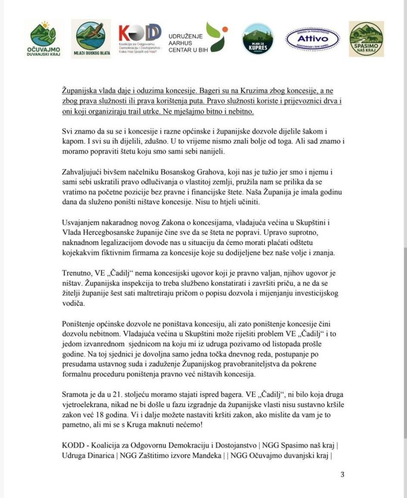 “Ne nasjedajte! U ovom trenutku nas ne spašava poništavanje dozvola nižeg ranga, već poništavanje koncesija. Presude Ustavnog suda daju pravnu podlogu da se poništi sve i do jedna koncesija u Hercegbosanskoj županiji.”