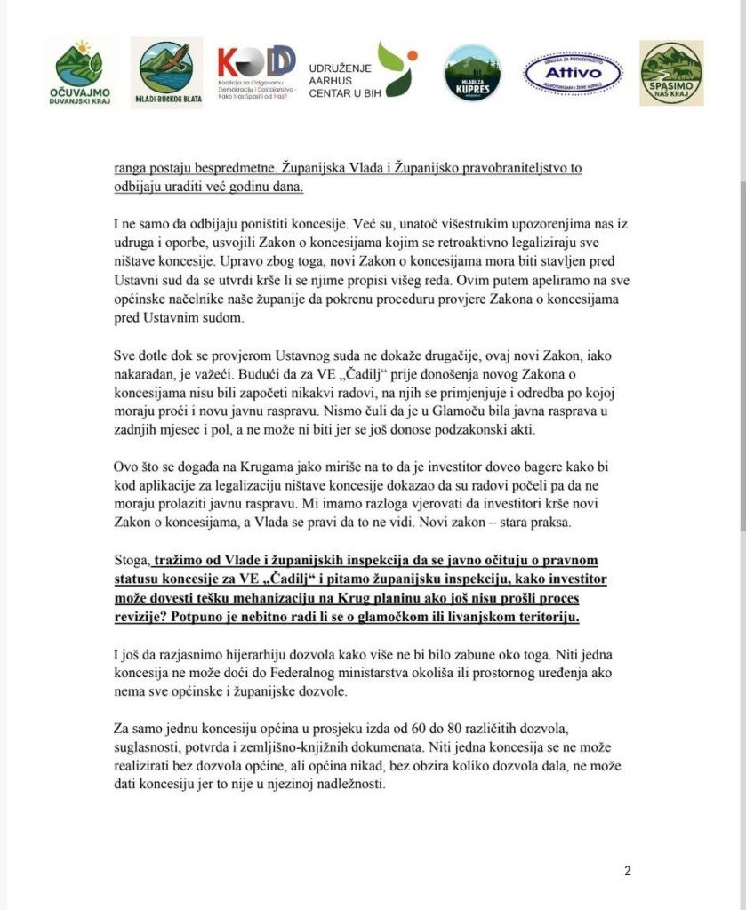 “Stoga, tražimo od Vlade i županijskih inspekcija da se javno očituju o pravnom statusu koncesije za VE „Čadilj“ i pitamo županijsku inspekciju, kako investitor može dovesti tešku mehanizaciju na Krug planinu ako još nisu prošli proces revizije?”